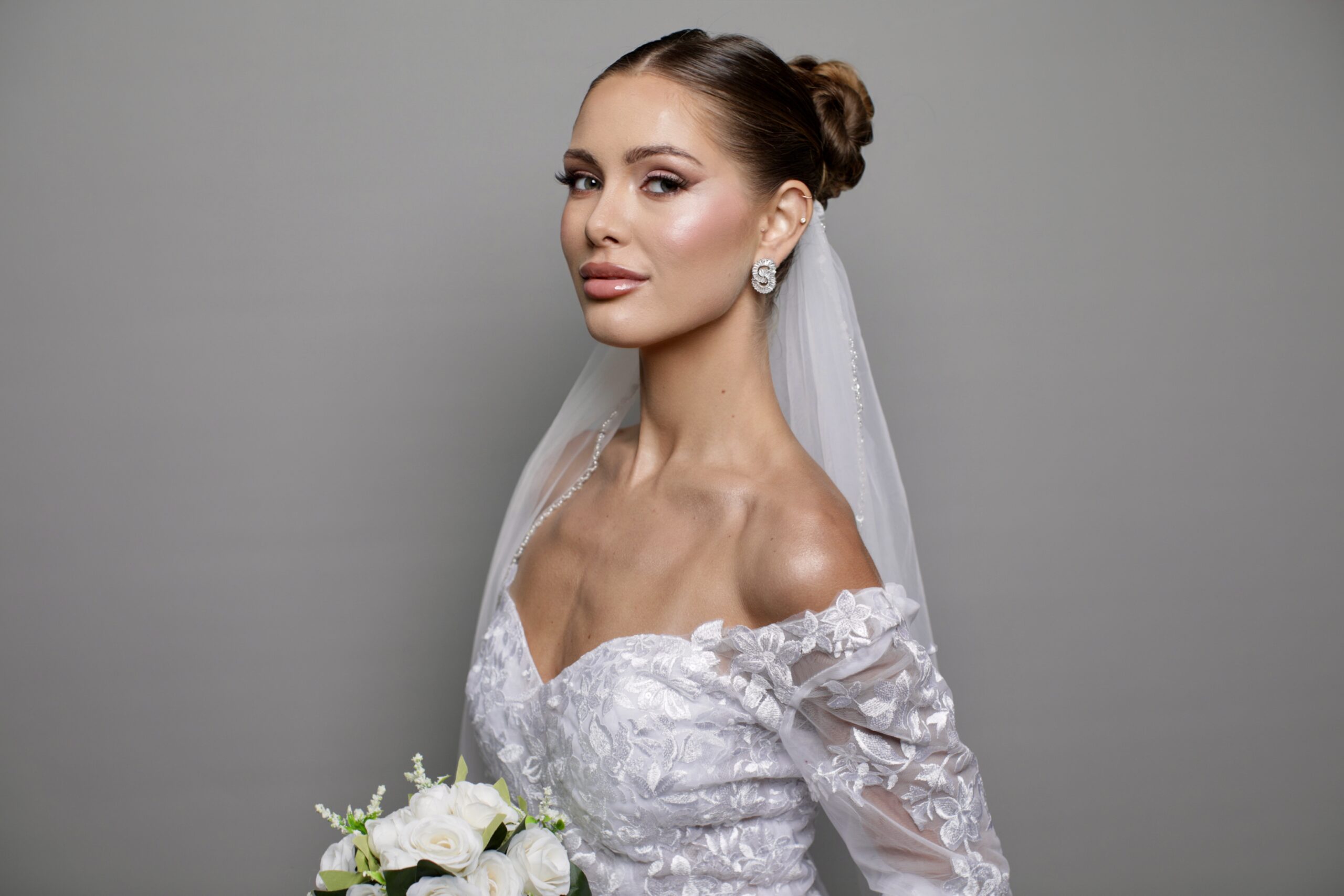 Classic bridal low bun with a polished finish, center part, and soft face-framing pieces for an elegant and timeless look.